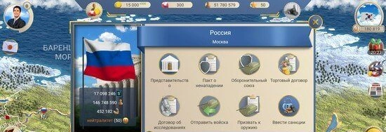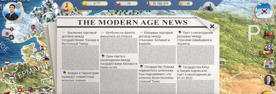 В начале игры вам предстоит выбрать страну, которой хотите управлять. Будь то США, Россия, Германия, Франция, Украина, Сирия или любое другое государство - каждая страна имеет свои уникальные особенности и стартовые условия.