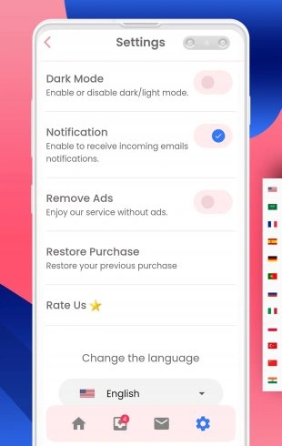 Разработчики позаботились о комфорте пользователей. В приложении есть темная тема для ночного использования, гибкие настройки уведомлений и поддержка русского языка. Можете одновременно управлять несколькими временными ящиками — очень удобно для разных задач.