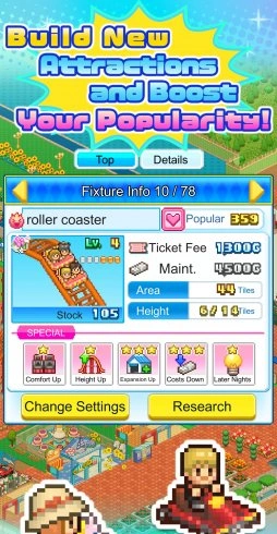 Строительство аттракционов здесь напоминает сборку конструктора, где каждая деталь важна. Карусели, батуты, игровые зоны — все это требует не просто денег, но и понимания того, что действительно нравится людям. Игра от японской студии Kairosoft сохраняет фирменный пиксельный стиль, который полюбился миллионам поклонников их симуляторов по всему миру.
