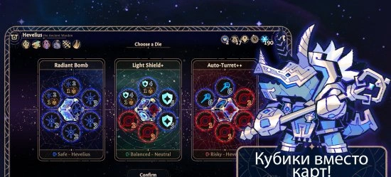 Игра предлагает огромный выбор игральных костей с различными эффектами. Одни дают стабильный результат и подходят для осторожной тактики, другие обещают невероятную мощь, но с непредсказуемыми последствиями. Особенность проекта — возможность редактировать грани кубиков, создавая идеальные комбинации под свой стиль.