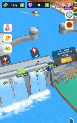 Dam Builder — это не классический кликер, где нужно бездумно тапать по экрану. Здесь важна стратегия: куда направить ресурсы, что улучшить в первую очередь, когда расширять флот. Игра учит планировать и видеть результаты своих решений.