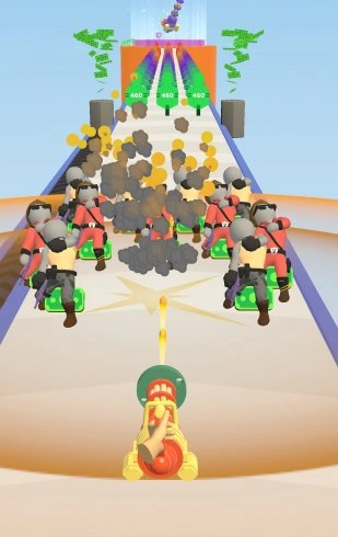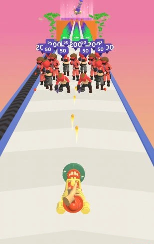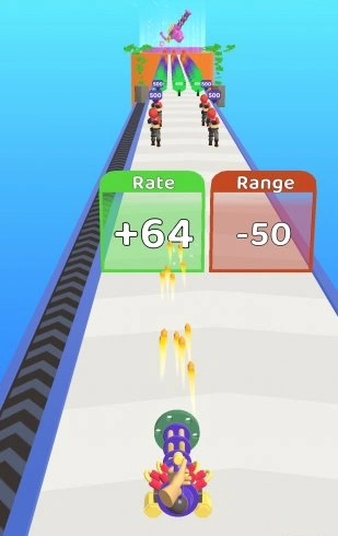 Основа геймплея строится вокруг одной идеи — чем больше оружия, тем лучше. Герой автоматически бежит по уровню, а задача игрока — собирать разбросанные стволы и детали, которые мгновенно присоединяются к его пулемёту. Это похоже на сборку конструктора на ходу: каждая новая деталь увеличивает огневую мощь, превращая скромное оружие в настоящую пушку.
