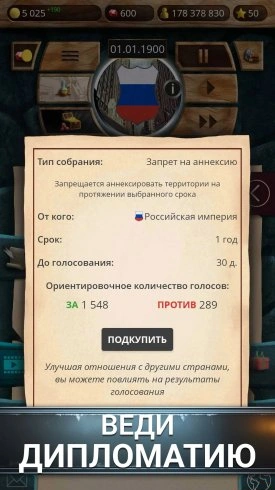 Война — не единственный путь к величию. Дипломатия может оказаться не менее эффективным инструментом. Заключайте выгодные торговые соглашения, подписывайте пакты о ненападении и устанавливайте дружественные отношения с другими державами. Открывайте посольства и развивайте экономические связи, укрепляя свои позиции на мировой арене без единого выстрела.