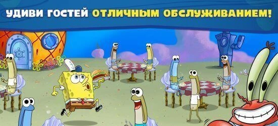 Яркая графика и знакомые персонажи из мультсериала создают неповторимую атмосферу подводного мира. Вы встретите Патрика, Сквидварда, Мистера Крабса и других любимых героев, которые придут перекусить в ваш ресторан.